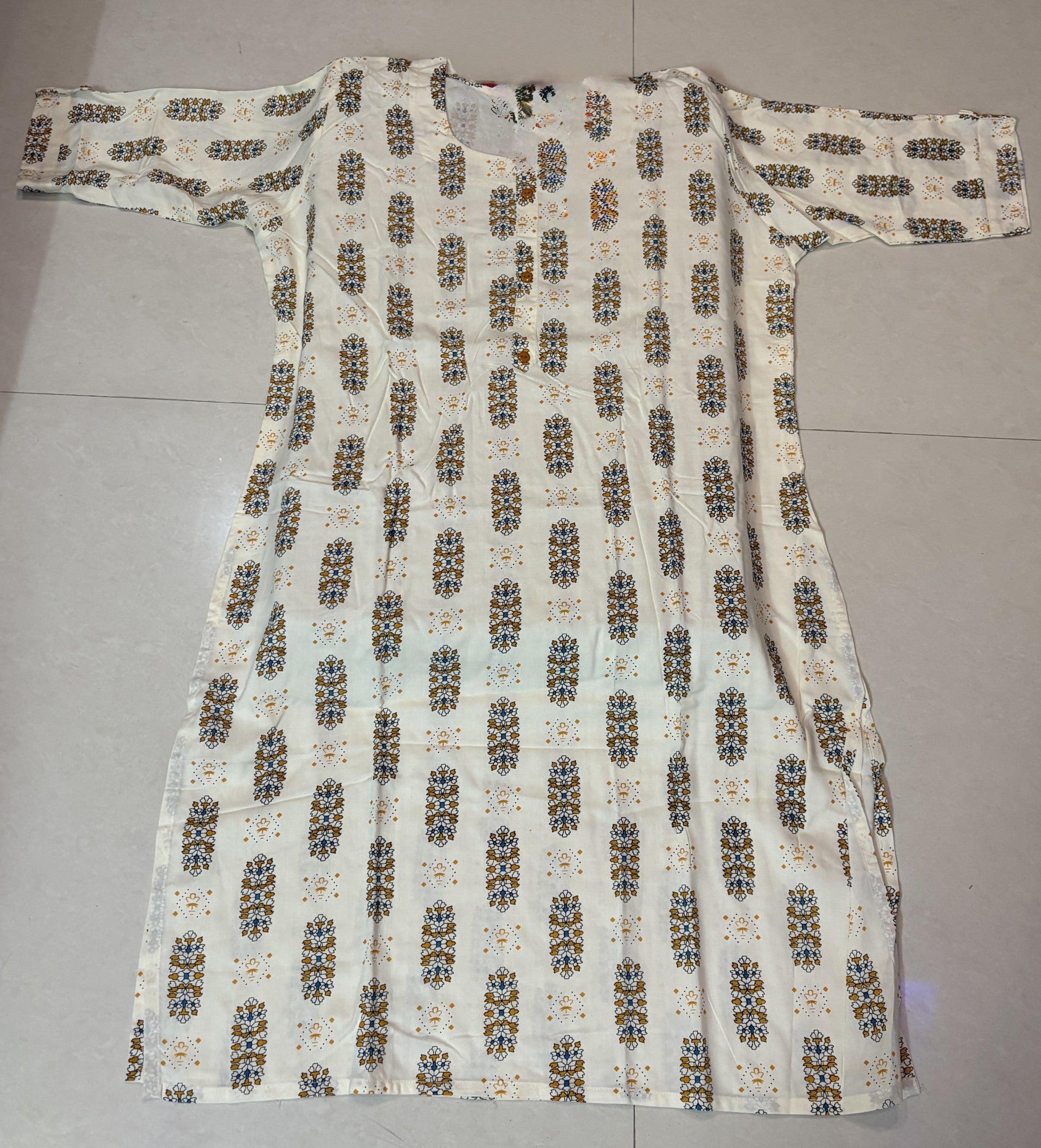 Embrace effortless elegance with this cream-colored kurti, featuring vertical rows of blue and yellow ornamental prints. Crafted from a soft, breathable cotton blend, it’s perfect for warm days and casual gatherings. The round neckline with a subtle decorative accent and short sleeves add a touch of charm to this versatile piece.