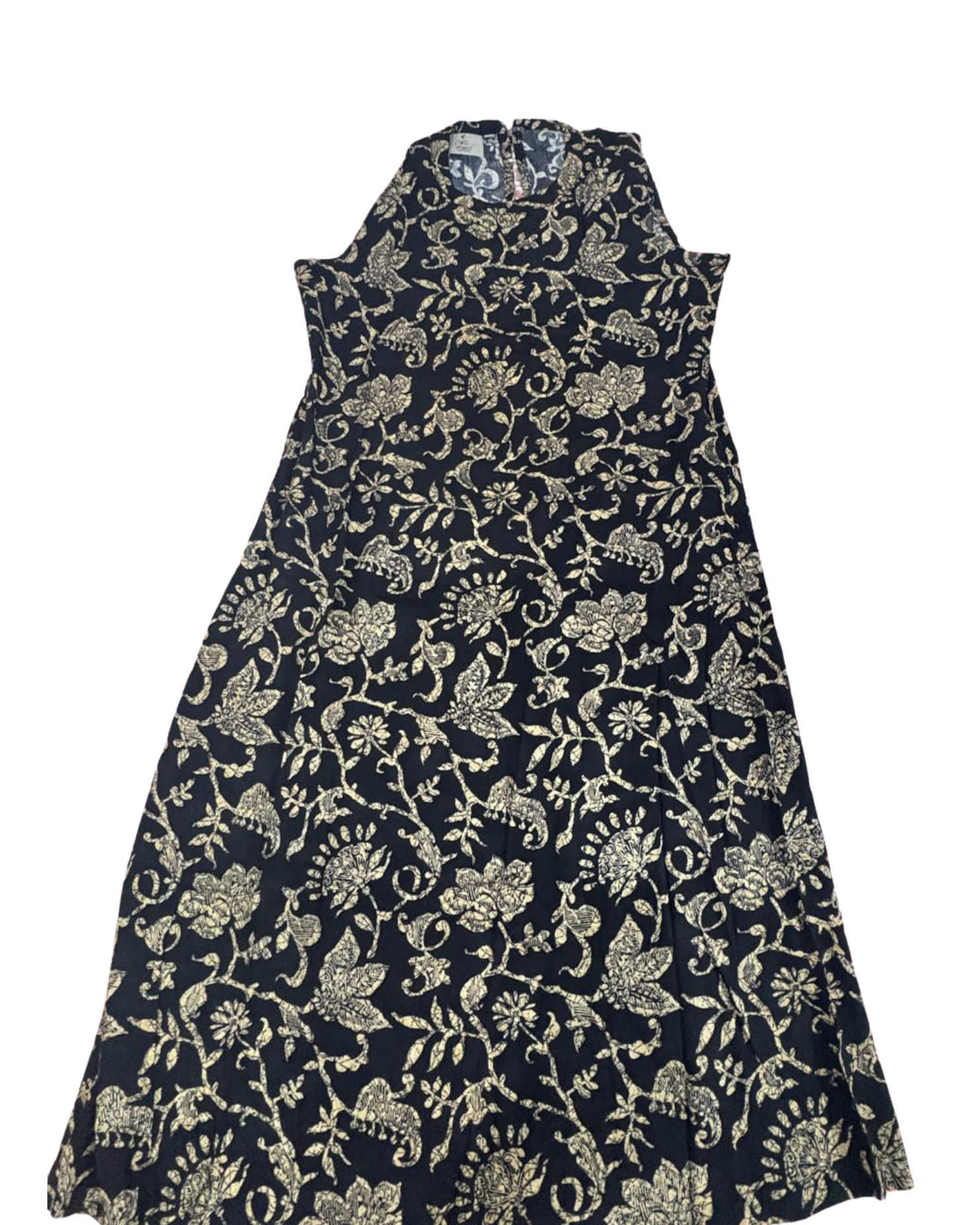 Step into timeless sophistication with our Midnight Bloom Co-ord, a stunning ensemble that blends traditional artistry with modern flair. This sleeveless tunic features a high neckline and a graceful flared hem, adorned with intricate golden floral and vine motifs that shimmer against a rich black backdrop. Paired with matching pants showcasing the same ornate design, this set is crafted for festive gatherings, cultural celebrations, or elegant evenings out.