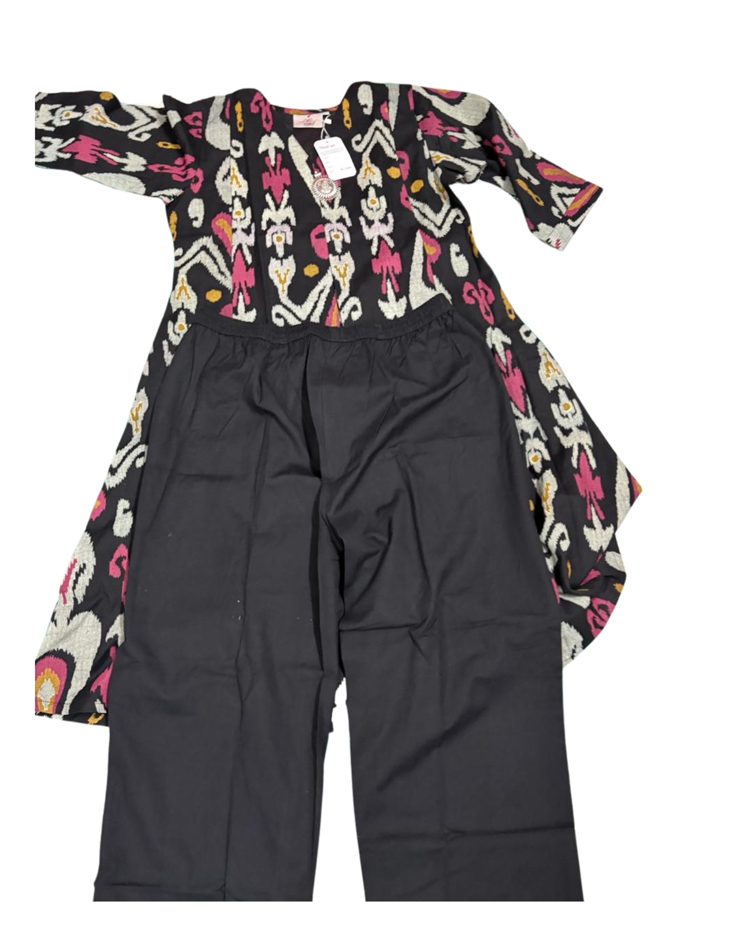 A black cotton kurti adorned with bold Ikat-inspired motifs in white, pink, and mustard yellow