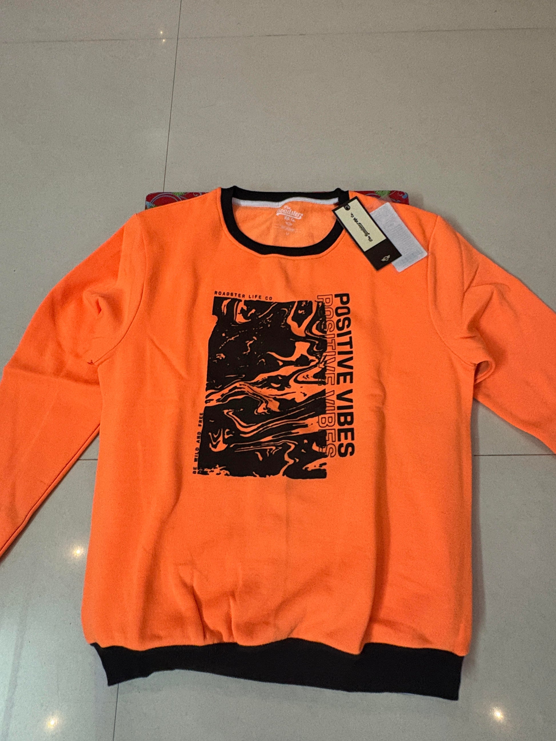 Radiate optimism with this vibrant orange sweatshirt featuring a bold black collar and a striking front graphic. The abstract rectangular design showcases wavy patterns and the uplifting phrase "POSITIVE VIBES" repeated vertically, making it a statement piece for casual wear. Crafted for comfort and style, this long-sleeve sweatshirt is perfect for cool evenings or laid-back outings. Tag still attached – brand new and ready to inspire.