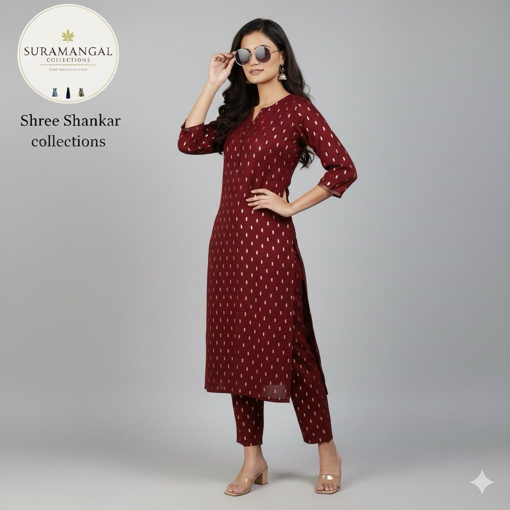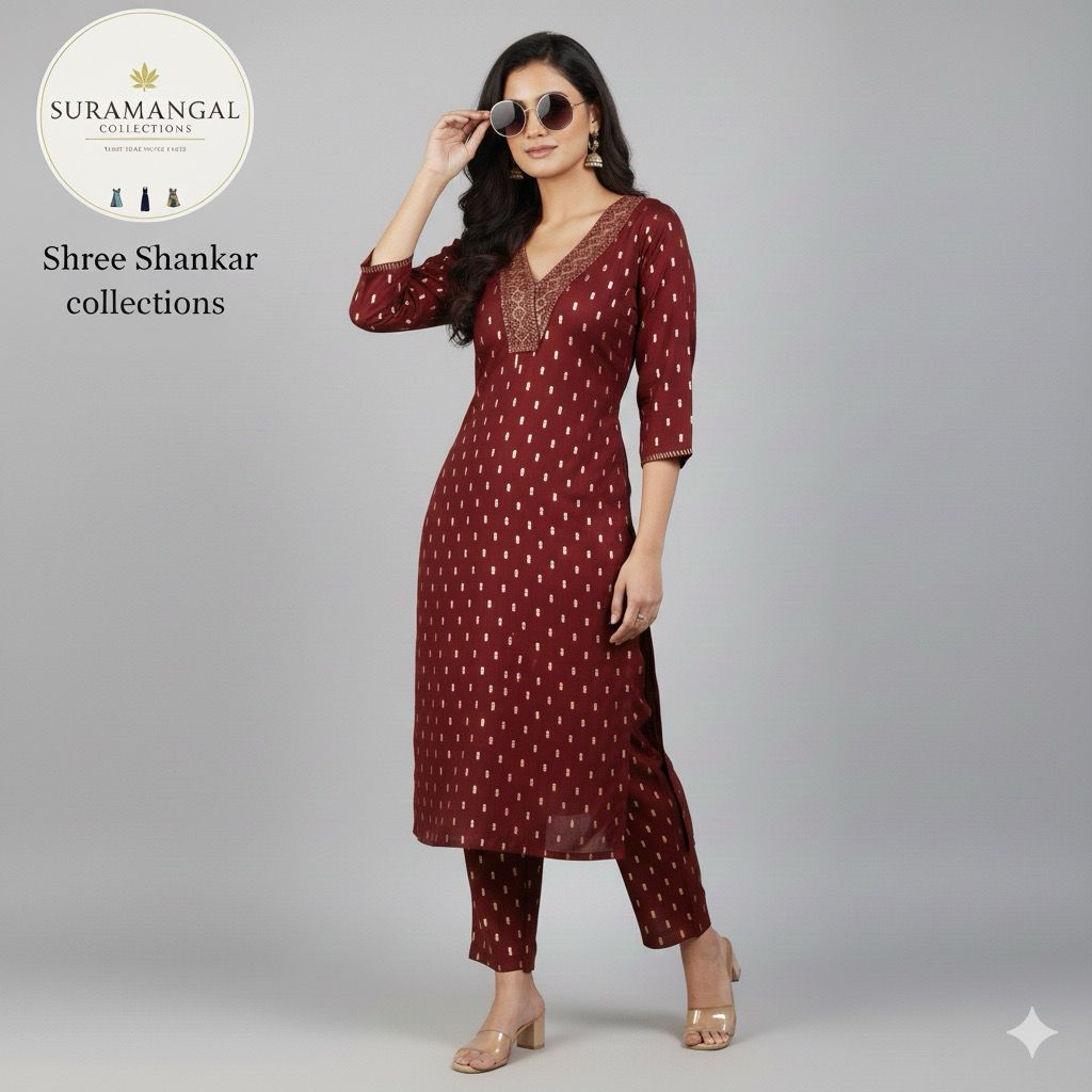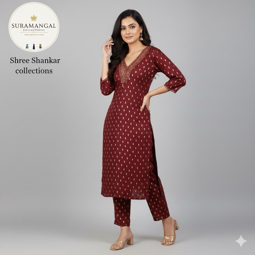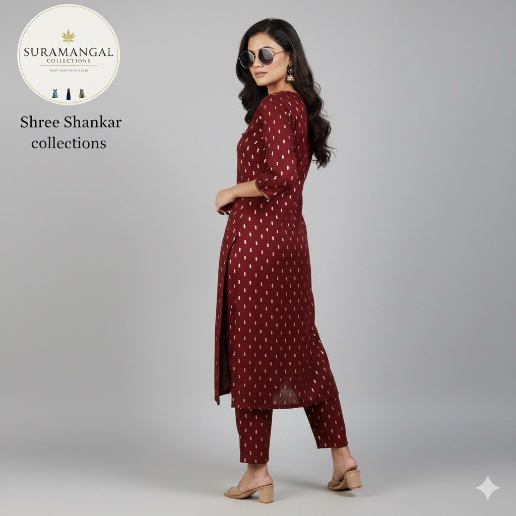 Elevate your ethnic wardrobe with the Suramangal Brown Co-ord Set from Shree Shankar Collections. This graceful ensemble features a long kurta with a flattering V-neckline, enhanced by delicate embroidery and golden motifs that shimmer with understated charm. Paired with matching straight-fit pants, it blends tradition with contemporary comfort—ideal for festive occasions or everyday elegance.
